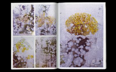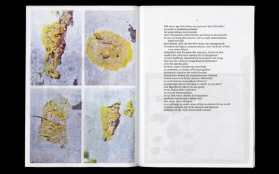 This book shares the transcript of we are all extremophiles I (performed at the jan van eyck academy in 2021), photographs of the spatial performance nitrophiles (which slowly decomposed over three months on the atrium windows of the academy), further enriched with research notes and generous reflective insights by laurens sparrius and cameron hu. we are all extremophiles will continue to question our capacity to perceive the changes, perils, intentions and unintended consequences written into lichen lifeforms, for 200 years to come.